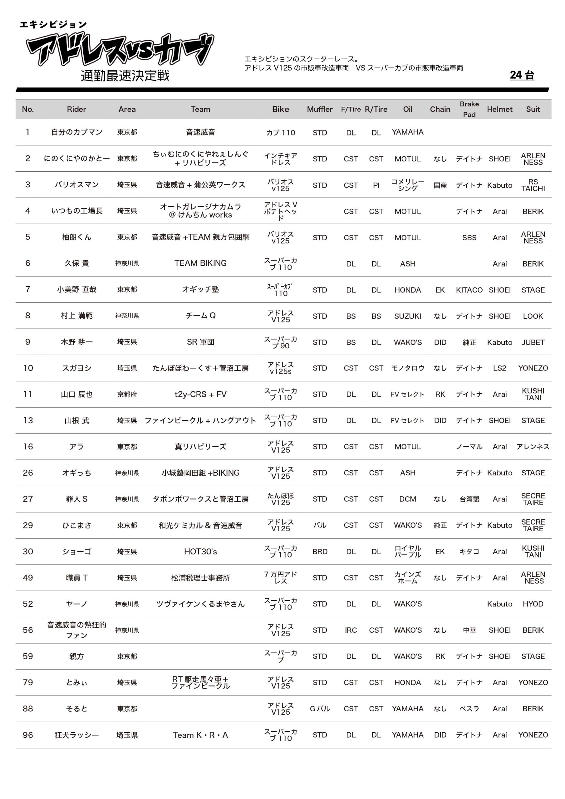 | 9 | 10 | スガヨシ | たんぽぽわーくす+菅沼工房 | アドレスv125s | 12 | 9:04.042 | 43.821 | 16.402 |